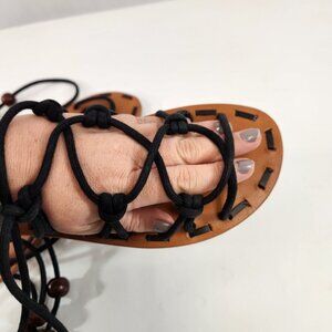 Lightly used Zara Women's Tie-Up / Lace-up Flat Sandals with black ties and a brown sole, size 37. Shoes are 9.75" in length and have never been worn. Please review photos closely for further details.