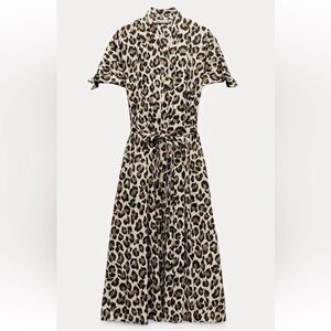 Zara Leopard Animal Print Button Up Down Midi Maxi Dress Pockets