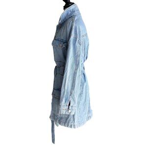 Stylish denim dress with button front. Features a belted waist and multiple pockets. Perfect for casual outings.