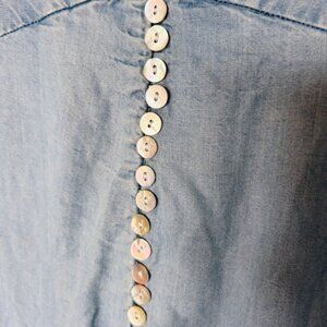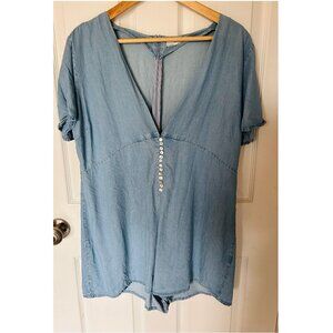 Chic light blue romper. Features a deep V-neck and button detail. Perfect for casual outings.