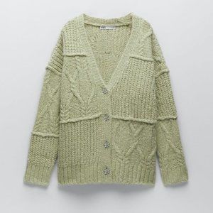 Zara Light Green Wool-Blend Patchwork Knit Cardigan