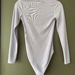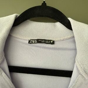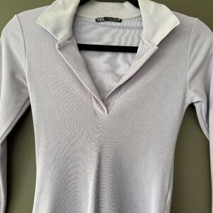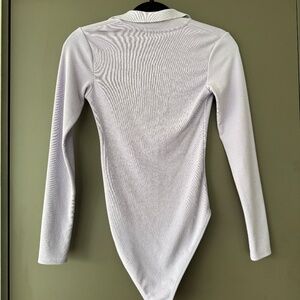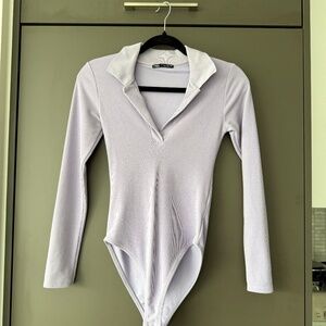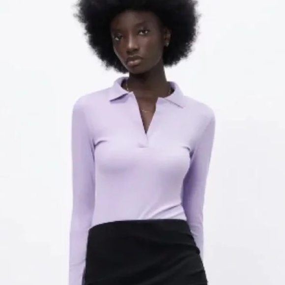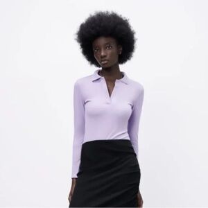 ZARA lilac long-sleeved polo bodysuit in size Small, featuring a sleek polo collar with a V-neck opening for a clean, modern silhouette. Soft, stretchy fabric with a smooth finish that hugs the body comfortably while maintaining a polished look. Perfect for workwear styling, minimal outfits, or dressed down with denim. A versatile wardrobe staple that transitions easily from day to night.