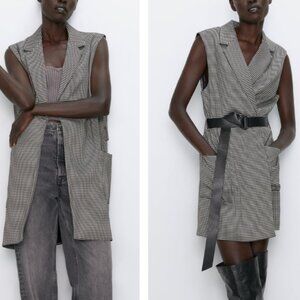 A chic and timeless Zara long vest in a classic black and white houndstooth pattern. This versatile piece is perfect for layering and adds a touch of sophistication to any outfit. It features a long, modern silhouette with functional pockets and belt loops for a customized fit.