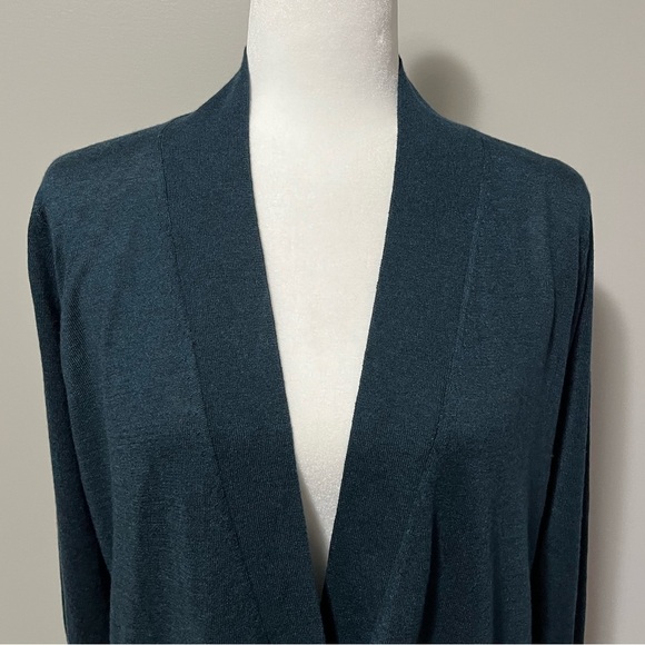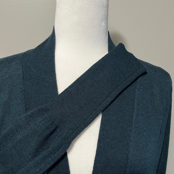 Excellent condition, hardly worn. Dark green (video shows true color). Lightweight knit. Ribbed sleeve cuffs. Cross over in front, connects at hem.
