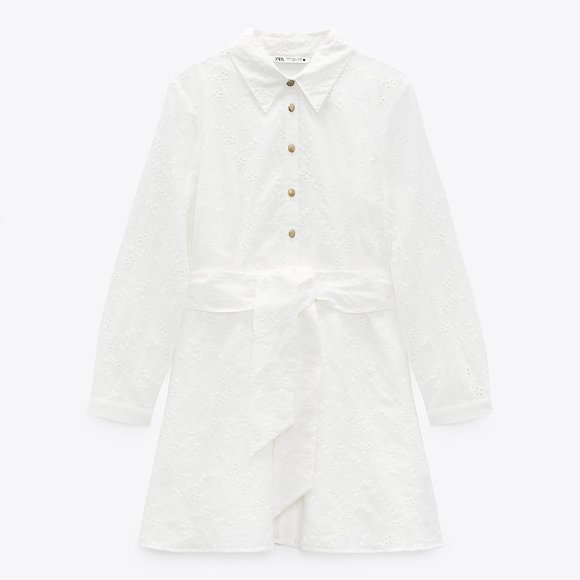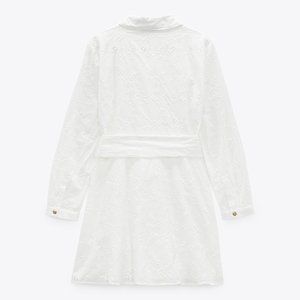 Zara Long Sleeve Openwork Embroidered Tie Waist White Mini Dress Small