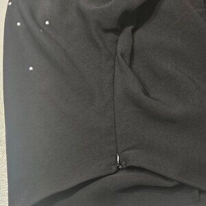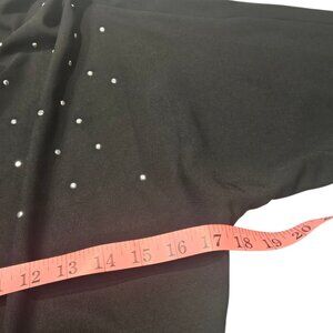 Cropped rhinestone blouse. Long sleeves. 100% polyester. Button at collar and side zipper. Gathered at neckline and waist. See photos for approximate measurements. Semi sheer fabric.