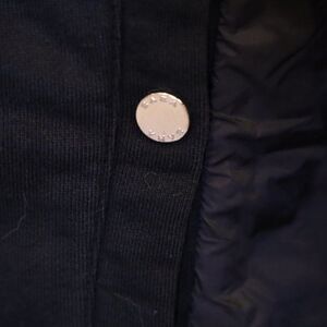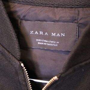 Classic black bomber jacket by Zara Man, featuring nylon panels at side. Zip closure with snaps on pockets.