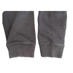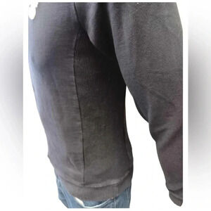 Navy blue knit with long sleeves, this top features a round neck and ribbing along cuffs, neckline, hem and side panels as well as raised lettering.
