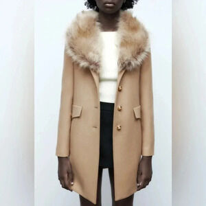 Zara Manteco Premium Wool Blend Tailored Camel Faux Fur Collar Coat