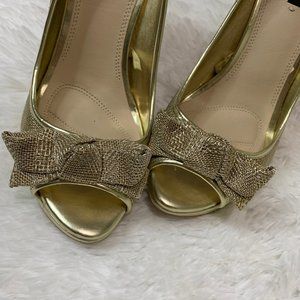Chic metallic gold heels with a bow accent. Ideal for elegant outings.