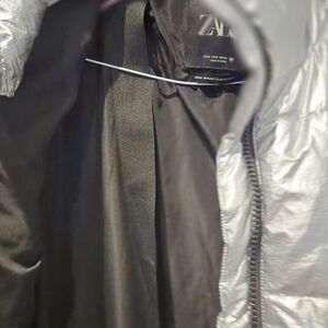 Chic metallic silver jacket from Zara. Ideal for stylish warmth. marked size small but oversized!fits more like a large I think. PTP: 24 1/2 lenghth:31.