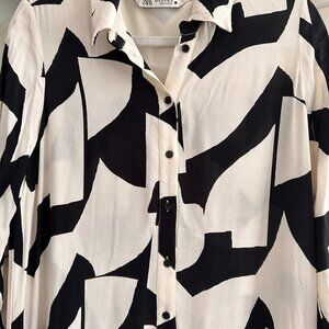 Make a bold statement with this ZARA monochrome abstract print maxi dress. Featuring a classic collared neckline, full button-down front, and long sleeves with buttoned cuffs, this dress offers a relaxed, full-length silhouette that flows effortlessly. The striking black and off-white geometric pattern adds edge and elegance, while the asymmetrical hemline gives it movement and modern flair. Perfect for day-to-night styling or a standout moment at any event.