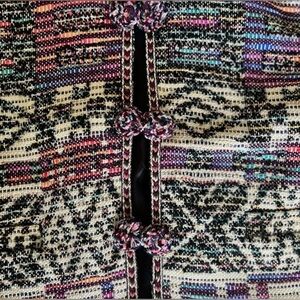 Stylish multicolor patterned knit jacket with decorative toggles. Features a textured woven design in cream, black and accented colors. Lightweight and versatile for layering. Adds a polished, feminine touch to outfits.