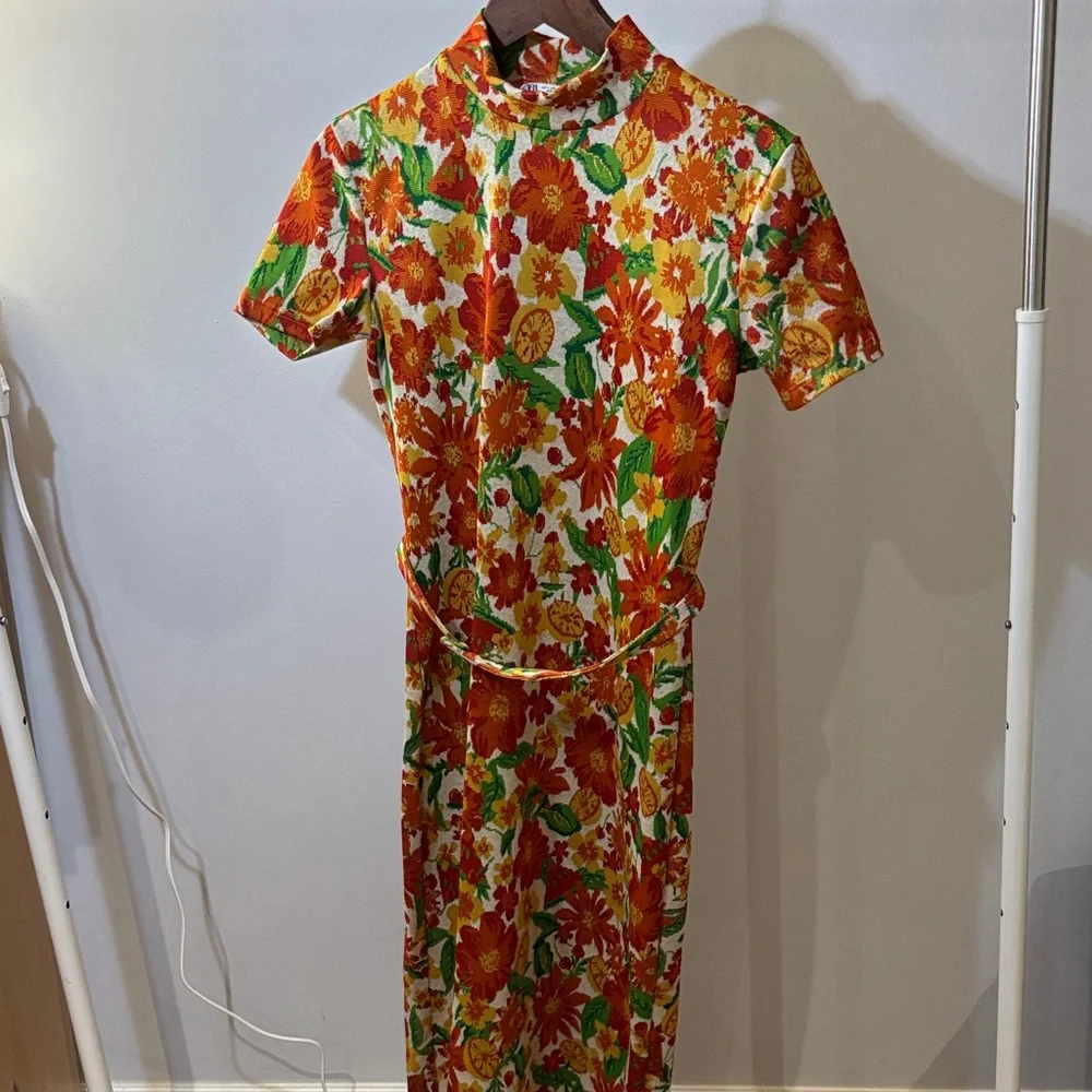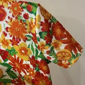 Colorful top with vibrant patterns. Features red, orange, and green hues.
