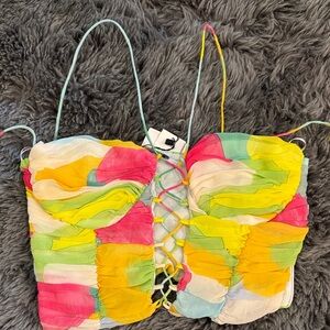 Stylish crop top with ruched design. Features lace-up front and vibrant colors.