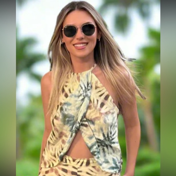 Vibrant halter top with tie-dye design. Features adjustable straps.