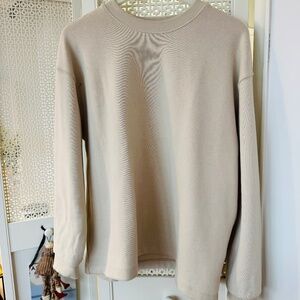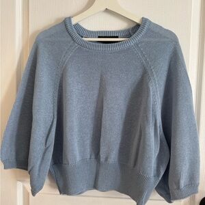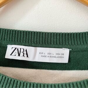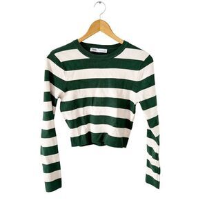 Zara women's cro sweater, green and cream striped sweater, long sleeve crewneck sweater, NWOT Zara top, soft knit cropped pullover, trendy striped knitwear, lightweight casual sweater, modern colorblock design, relaxed fit crop top, transitional season layering piece, worn by fashion-forward women, street style lovers, trendsetters, and Zara brand fans, preppy, collegiate