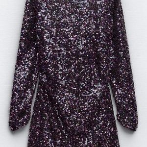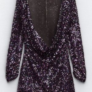 Dress with round deck and long sleeves. Flowy neckline at the back with adjustable thin straps. Sequin detail. Fully lined inside
