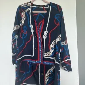 Elegant navy dress with rope design. Features red, blue, and white details. Mini. Used, like new.