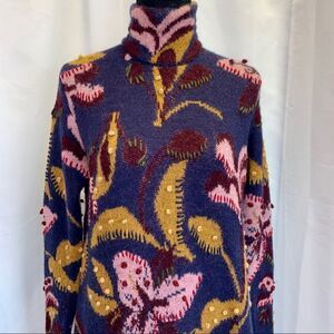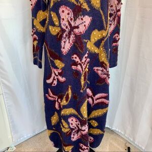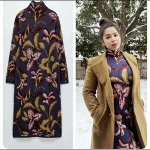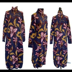 Elegant maxi dress with floral pattern. Features a high neckline and long sleeves. Perfect for any occasion.