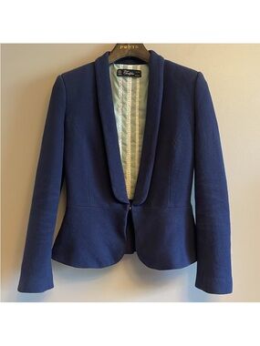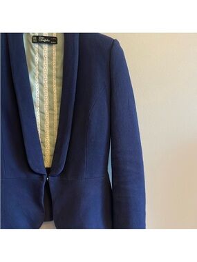 Zara tailored navy blazer with a fitted silhouette and peplum back. Single-button closure. Versatile piece.