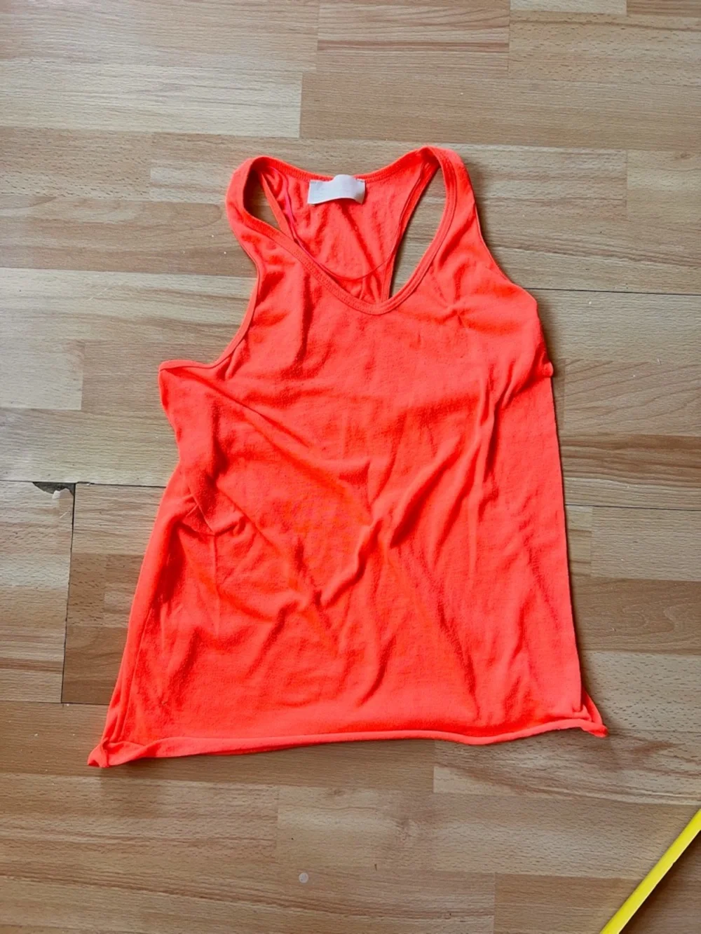 Vibrant neon orange racerback tank from Zara. Soft, lightweight knit for easy wear. Sleeveless cut offers full range of motion. Simple silhouette for layering or solo wear.
