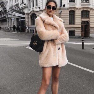 Gorgeous faux fur coat in nude/blush color by Zara. This is undoubtedly the most beautiful, plush, soft faux fur ever made by Zara.