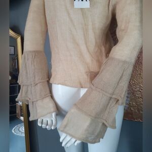 Chic beige sweater with ruffle details from Zara. Brand new, never worn,, perfect condition. Wool, alpaca and acrylic blend, see pics for full material composition. Extra long dramatic ruffle sleeves, ruffle detail around neck as well, boat neck. Lightweight and finely knit, perfect for spring! Size large, has stretch, see flat lay measurements below!