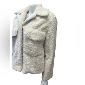 Zara Teddy Jacket/Coat in Off-White, short, 4 snap button closure with collar, two large chest pockets and two side pockets.