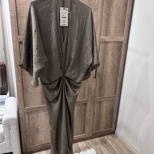 Elegant draped dress with a textured finish. Features a gathered front detail. Perfect for evening wear or throw on with sneakers in the day!