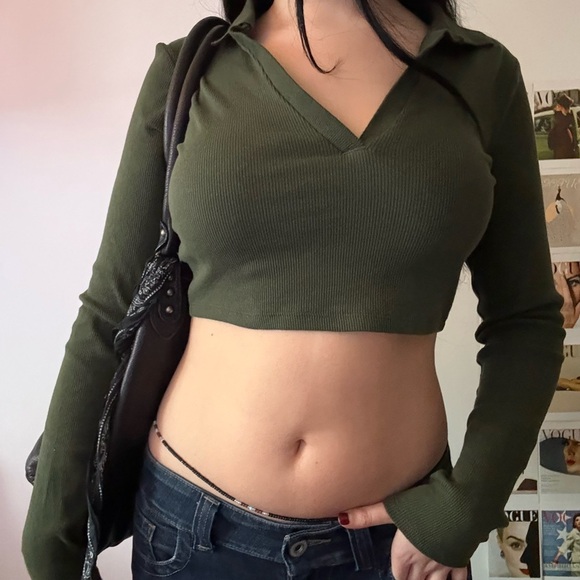 Chic forest green crop top with V-neck. Long sleeves for a trendy look.