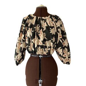 Zara Olive and Yellow Floral Crop Top with Puffed Sleeves