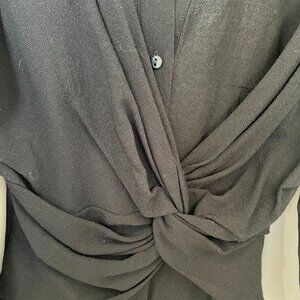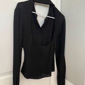 Black button-down shirt with criss-cross detailing in front. Open back.