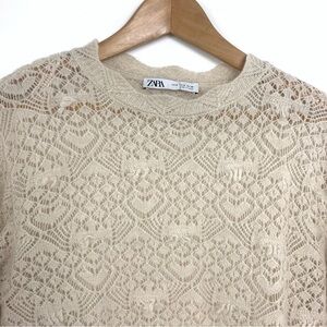 A delicate and feminine Zara open-knit sweater featuring an intricate lace-like pattern. This soft and airy pullover is made from an alpaca wool blend, giving it a cozy yet lightweight feel. The relaxed fit and semi-sheer design make it perfect for layering over camisoles or bralettes. With a high crew neckline and long sleeves, this sweater adds a touch of elegance to any outfit.
