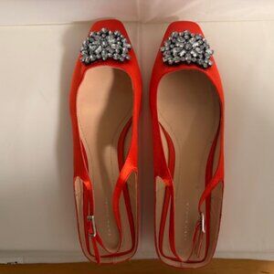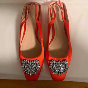 Stylish orange flats with sparkling silver embellishments. Perfect for any occasion.