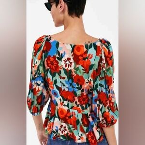This vibrant Zara blouse features a striking combination of orange and blue hues, enhanced by its smocked peplum design. The bell sleeves add a touch of elegance, making it a versatile choice for various occasions. Its unique style ensures a standout look with a blend of sophistication and charm.