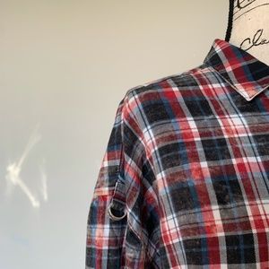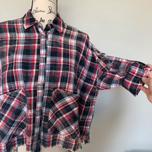 An oversized flannel that was purposefully designed to look worn (i.e. it's supposed to look like that!). The fabric is soft and not as thick as regular flannel. It is not cropped but the fit is shorter than a regular fit flannel. As all the clothes I sell, it has no flaws and has been worn twice maximum. If you want to know the specific measurements, feel free to request them! :)