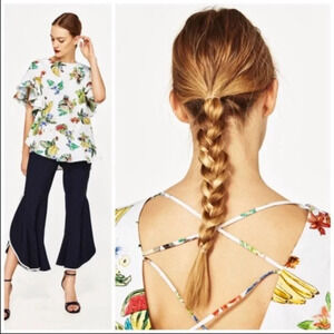 Zara Denim Oversized Tropical Print Ruffle Top Blouse Sz XS