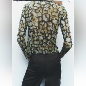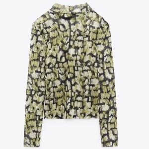 ZARA PRINTED TULLE SHIRT BLACK GREEN SZ M