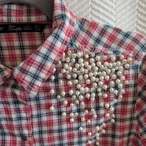 Zara, Plaid, Checkered, Pearl, Embellished, Button up, Western, Cowboy, Country, Rodeo, Chic, Statement, Size Large, Western blouse, fall, festival, Calgary Stampede, Country, Pearls, Beading
