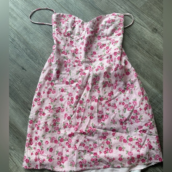 Elegant pink dress with delicate floral design. Beautiful tie back with open back detail. Beautiful dress. Fit is smaller than xxl