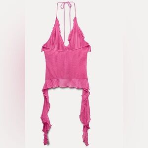 Vibrant pink halter top by Zara. Features ruffled details and tie back. Perfect for a stylish look!