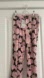 Elegant trousers with a pink floral pattern on a black background. Ideal for a fashionable outfit.