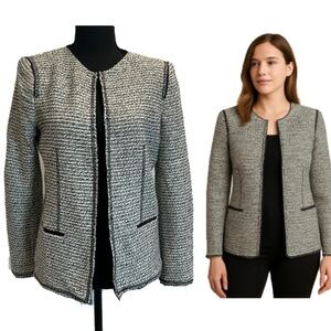 Chic plaid shirt jacket with button closure. Features black, cream, and purple tones.