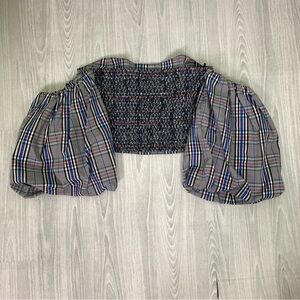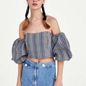 Zara Plaid Off-Shoulder Puff Sleeve Crop Top Sz S