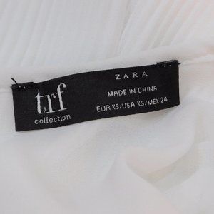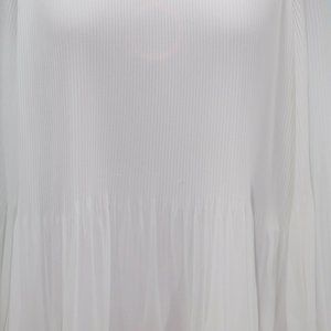 A lovely flowy white pleated blouse. Elegant in it's simplicity the nature of the fabric and it's lines are what makes it wonderful. One of the close up photos is to show the pleats the other is to show 2 small catches on the front of the top (not noticeable but worth noting). The sleeves are flowy as well with a buttoned cuff. The top has a thin lining underneath.