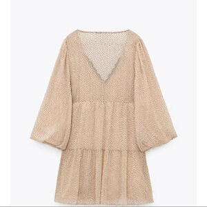 Zara Polka Dot Lace Trim Tiered Babydoll Mini Dress Beige Pink Sz Small