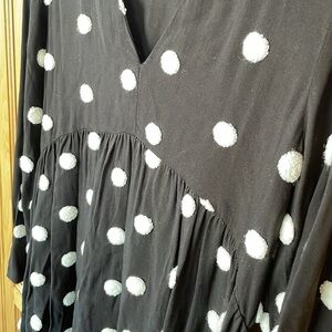 EUC black with fuzzy white polka dots midi dress with long sleeves and v neck. Very cute and unique piece!ruffle hem, soft acrylic and viscose blend.