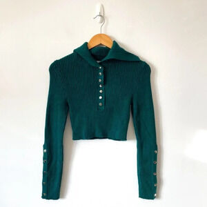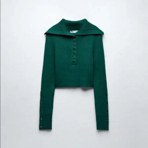 Zara Polo Collared Ribbed Snap Button Knit Long Sleeve Sweater Shirt Green Sz S