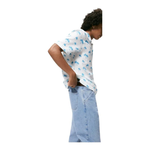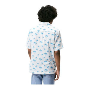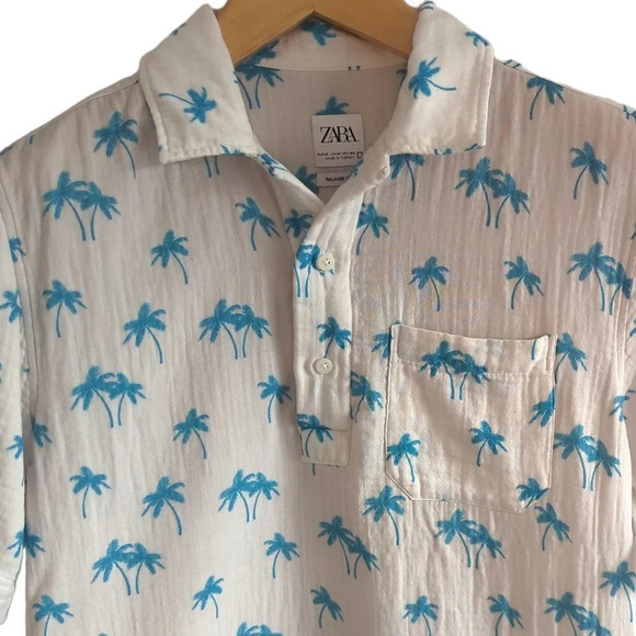 This is a white short sleeve collared shirt with an allover blue palm tree print by Zara.